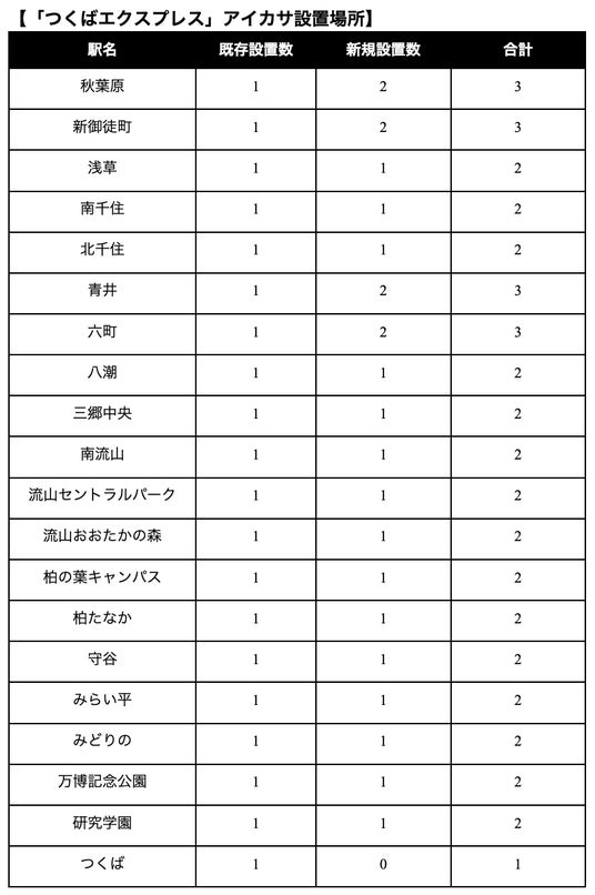 今回の23か所の増設により、合計スポット数は43か所となります。また、改札付近だけではなく、地上出口付近への設置を行うことで、これまで以上につくばエクスプレスを利用するお客様に、「急な雨の日でも、便利に、快適に」移動できる環境を提供します。