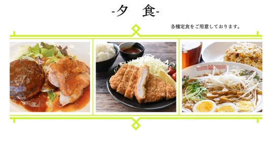 また、地元の野菜をふんだんに使用した朝食ブッフェや、日替わり弁当や定食などの食事サービスもご提供いたします。