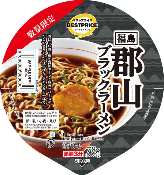 このたび発売する「トップバリュベストプライス 福島郡山ブラックラーメン」は、明治時代に郡山駅前で創業した食堂の醤油ラーメンが元祖と言われたご当地グルメ「郡山ブラックラーメン」の味をイメージし再現した商品です。香ばしい風味の漆黒色の醤油スープと豚ガラベースのだしが特長で、あっさりとしながらもまろやかなコクのあるおいしさです。