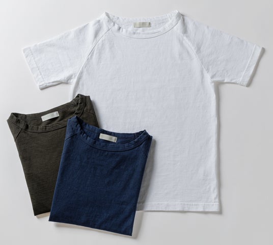 今回新色が登場するのは、飽きのこないベーシックなシルエットと着心地の良さで、発売以来ご好評をいただいている「ムラ糸クルーネックTシャツ」。綿花から糸を作る過程で生まれる、通常は廃棄される不揃いな“落ち綿”を再利用したサステナブルなアイテムです。ムラ糸で編まれた生地は、表面の自然なムラ感が生み出す豊かな表情に加え、高い耐久性を持ち、洗濯を重ねることで味わいが増していく経年変化も魅力のひとつ。トレンドに左右されず、長く着るほどに愛着が増していきます。エジプト綿やスーピマ綿と並び世界三大コットンのひとつと称されるトルファン綿を使用し、まるでシルクのような光沢と、しっとりなめらかな肌触りを実現しました。