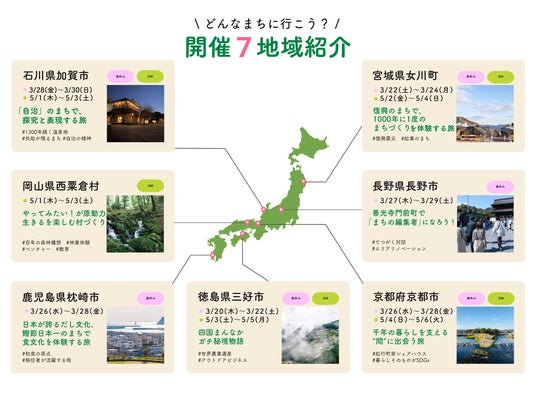 「宮城県女川町」「長野県長野市」「石川県加賀市」「京都府京都市」「岡山県西粟倉村」「徳島県三好市」「鹿児島県枕崎市」の7地域が参画。現地でまちづくりを担うコーディネーターが道先案内人となり、観光旅行では触れられない地域の魅力をご紹介します。