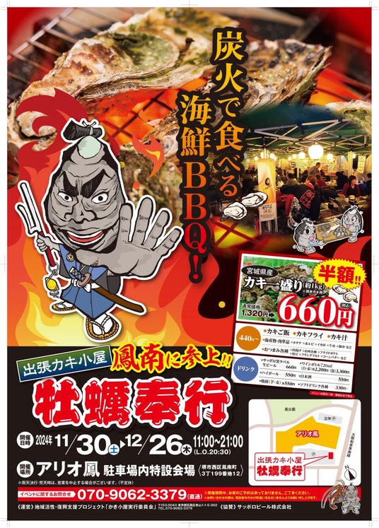 11/30~ 出張カキ小屋がアリオ鳳に初出店!「地域活性・復興支援プロジェクト 牡蠣奉行」休日にご家族と!お仕事帰りの皆様も!