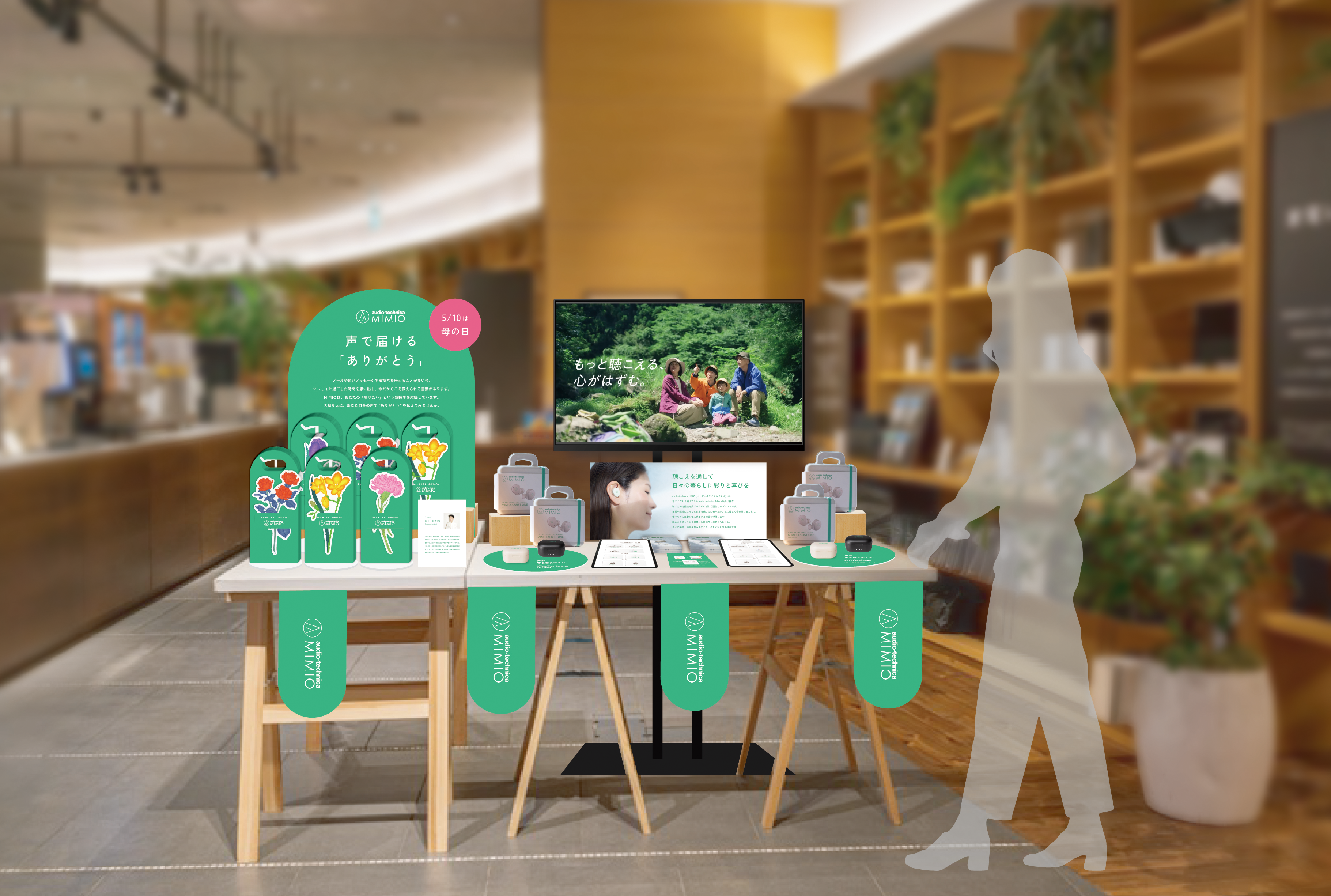 ヒアリングアシストイヤホン「MIMIO ASSIST ONE」の体験展示に加え、限定フラワーカード配布や花束引換券プレゼントも実施