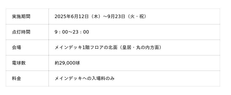 無数のLED電球を夜空に瞬く「天の川」に見立て、涼しげな光で夏の風情を演出する恒例の「天の川イルミネーション」。 メインデッキで夜景とイルミネーションの競演がお楽しみいただけます。 2025年は、目覚めてすぐキスできる”恋するハミガキ”「デンティス」とのコラボレーションで好評開催中! 期間中は、デンティスカラーであるグリーンのイルミネーションで恋するカップルを応援します。 詳細はデンティスの公式サイトをご覧ください。 https://liberta-online.jp/shop/information/news_dt_amanogawa2025 【天の川イルミネーション supported by デンティス】