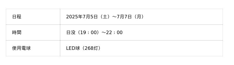 7月5日(土)~7日(月)の3日間限定で、特別ライトアップ「七夕インフィニティ・ダイヤモンドヴェール」を日没(19:00)~22時まで、点灯します。 塔体に設置された268台のLEDライト1つ1つの光が、じんわりと明滅し、天の川のように、揺らめくライトアップをお楽しみいただけます。 【七夕インフィニティ・ダイヤモンドヴェール】