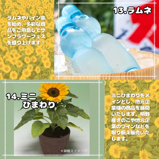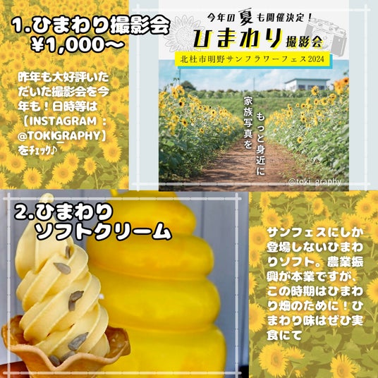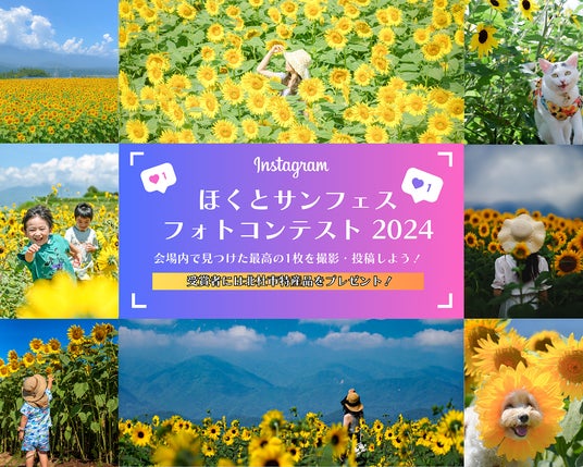 会場内でのとっておきの1枚をー「ほくとサンフェスフォトコンテスト2024」開催!「北杜市明野サンフラワーフェス2024」開催期間中、「ほくとサンフェスフォトコンテスト2024」を開催。Instagramを通じて、会場で撮影した写真を募集します。入賞者には「北杜市まるごとグルメ詰め合わせ」をお送りします。入賞作品は来年度のチラシ・ポスターになるかも。ひまわり畑でのとっておきの1枚を応募ください。