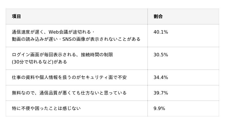 特に、通信速度や安定性といった通信品質に関する不満や、セキュリティ面への不安が挙げられており、外出先でのインターネット利用において、必ずしも快適・安心に利用できているとは言えない実態がうかがえます。