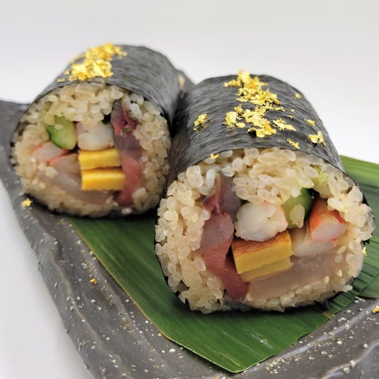 文久元年創業の江戸前寿司の老舗、九段下「寿司政」。鮪中トロ、金目鯛、ずわい蟹などの具材に、金粉をあしらった贅沢な恵方巻です。