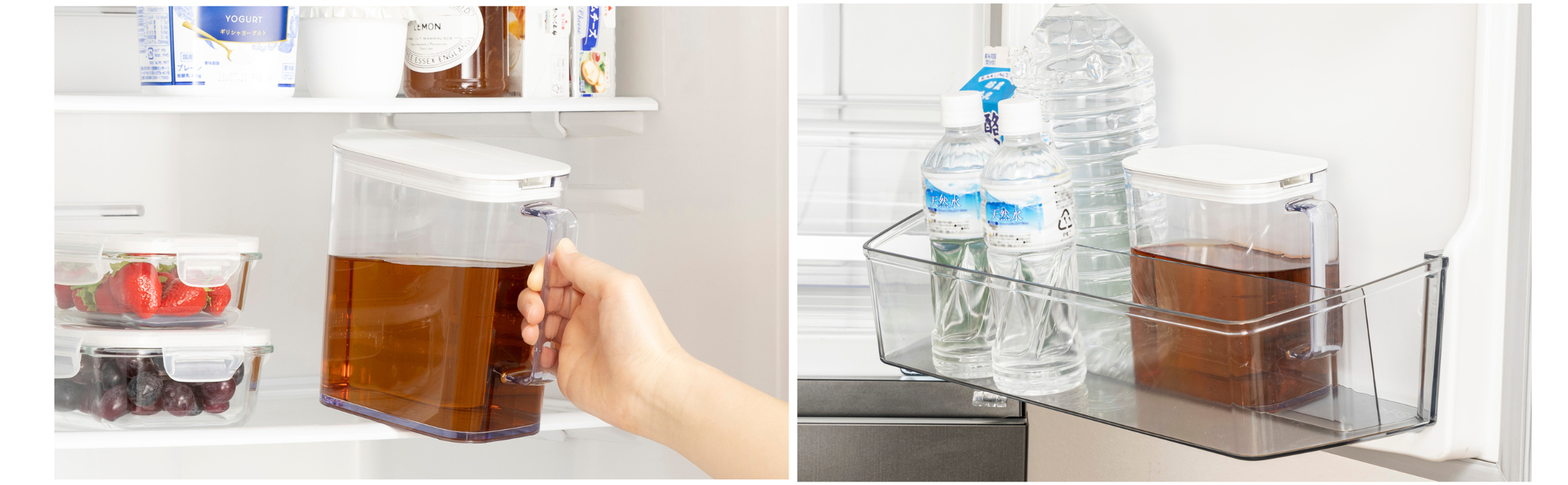 大人気の「棚置きできる冷水筒」に新サイズ登場!冷蔵庫の棚やドアポケットにスッキリ収まる
