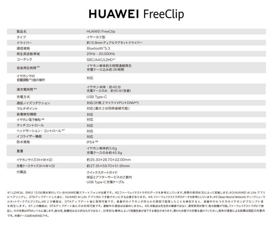 ※1: バッテリー駆動時間および充電データは、ファーウェイラボのテスト結果によるものです。実際の結果は、音量、オーディオソース、環境干渉、製品機能、および使用習慣によって異なる場合があります。