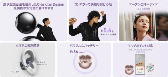 ファーウェイが、3年を超える年月をかけ開発したイヤーカフ型のオープン型イヤホンです。形状記憶合金を使用した革新的なC-bridge Design(C-ブリッジデザイン)により、快適な着け心地と圧倒的な安定感を両立し、TWSイヤホンの未来を牽引する新しいユーザーエクスペリエンスをもたらします。