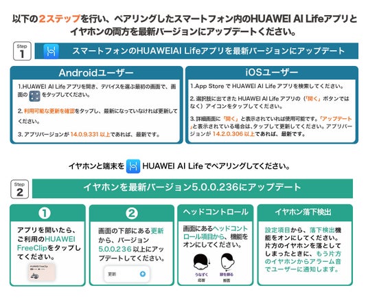 新機能をご使用いただくためには、スマートフォンアプリ「HUAWEI AI Life」を最新バージョンまでアップデートし、その後アプリから『HUAWEI FreeClip』とペアリングしてデバイスのバージョンを最新にアップデートする必要があります。※2