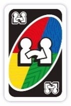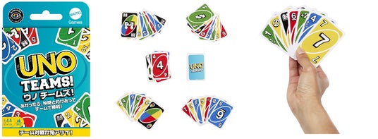 「ウノ チームズ」は、チーム対戦型の商品です。基本ルールはウノと同じでプレイヤーは色、数字、シンボルをマッチさせますが、二人一組でチームを組み、向かい合って座ります。特別なカードとルールでチームメイトの手札を予想したり、どちらかが上がったら残った人のカードをはんぶんこしたり、チームメイトと助け合って一緒に勝利を目指します。最後の1枚になったら"ウノ!"と叫ぶのを忘れずに!