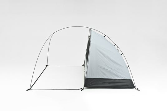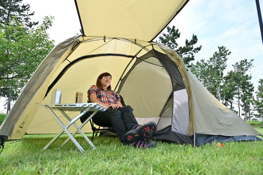 名前の通り、前室の広さが一番の特長です。前室にある3つのパネルを閉じてもぎりぎり2人が座れるぐらいのスペースがあり、ソロキャンプならイスとテーブル、シートバッグを置いても余裕の広さです。キャンプツーリングは車のキャンプと違い、雨が降ったら荷物を一時避難させたり車の中で過ごしたりできません。テントに前室がなければ、寝袋に入ってテントの中でぼんやり過ごすだけということも。雨の日でもと言うと大げさですが、どんな環境でも楽しくキャンプをしていただきたいですし、前室が広いことでキャンプの楽しみ方もグッと広がるそんなテントです。