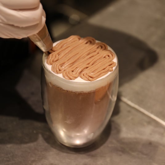 カカオの選定からこだわるチョコドリンクの上に、さくさくのフィアンティーヌと生クリームをすり切りでトッピング。