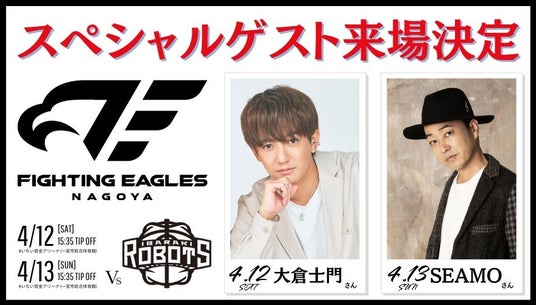 ファイティングイーグルス名古屋(以下、FE名古屋)が4月12日(土)13日(日)に、愛知県一宮市 いちい信金アリーナ(一宮市総合体育館)にて開催する りそなグループ B.LEAGUE 2024-25 SEASON 第31節 茨城ロボッツ戦に、タレントの大倉士門さん、歌手のSEAMO(シーモ)さんが来場することが決定いたしました。