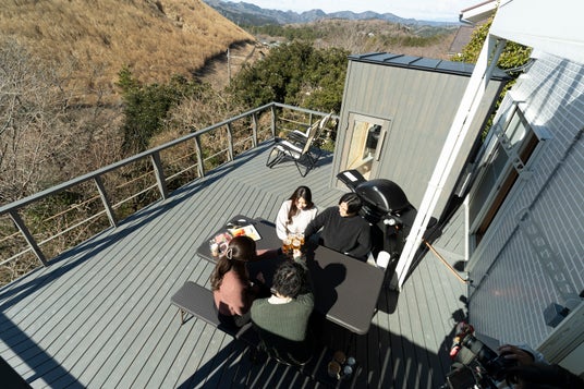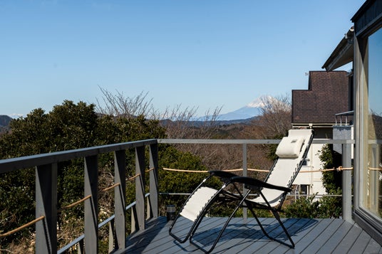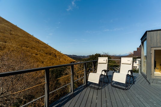 広々としたウッドデッキでは、大室山を眺めながら贅沢なBBQも可能。晴れた日には雄大な富士山も望むことができ、この上ない景観の中でプライベートな時間をお過ごしいただけます。