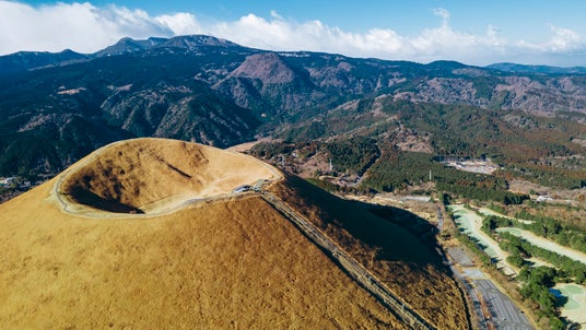 大室山は伊豆エリアを代表するランドマークであり、国指定の天然記念物。伊豆東部火山群で最大級のスコリア丘として知られています。古来より継承されてきた「山焼き」の伝統行事により、その特徴的な椀を伏せたような美しい山容が守り継がれています。