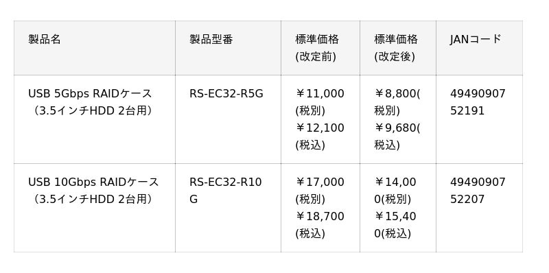 ラトックシステム株式会社(本社:大阪府、代表取締役 近藤正和、以下「ラトックシステム」)は、本日付でRAID対応HDDケース「RS-EC32-R5G」「RS-EC32-R10G」を約20%値下げいたします。