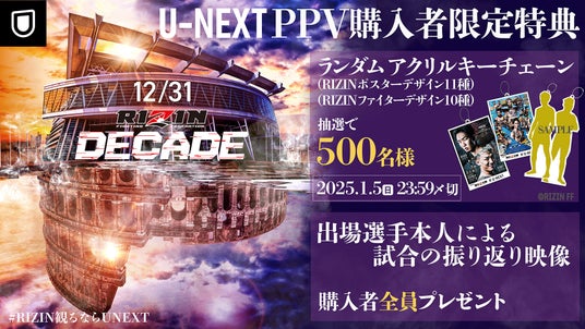 USEN-NEXT GROUPの株式会社U-NEXT(本社:東京都品川区、代表取締役社長:堤 天心)が運営する動画配信サービス「U-NEXT」は、2024年12月31日(火)に『RIZIN DECADE』をライブ配信いたします。U-NEXTで配信チケット購入者限定の特典やキャンペーンも実施いたします。