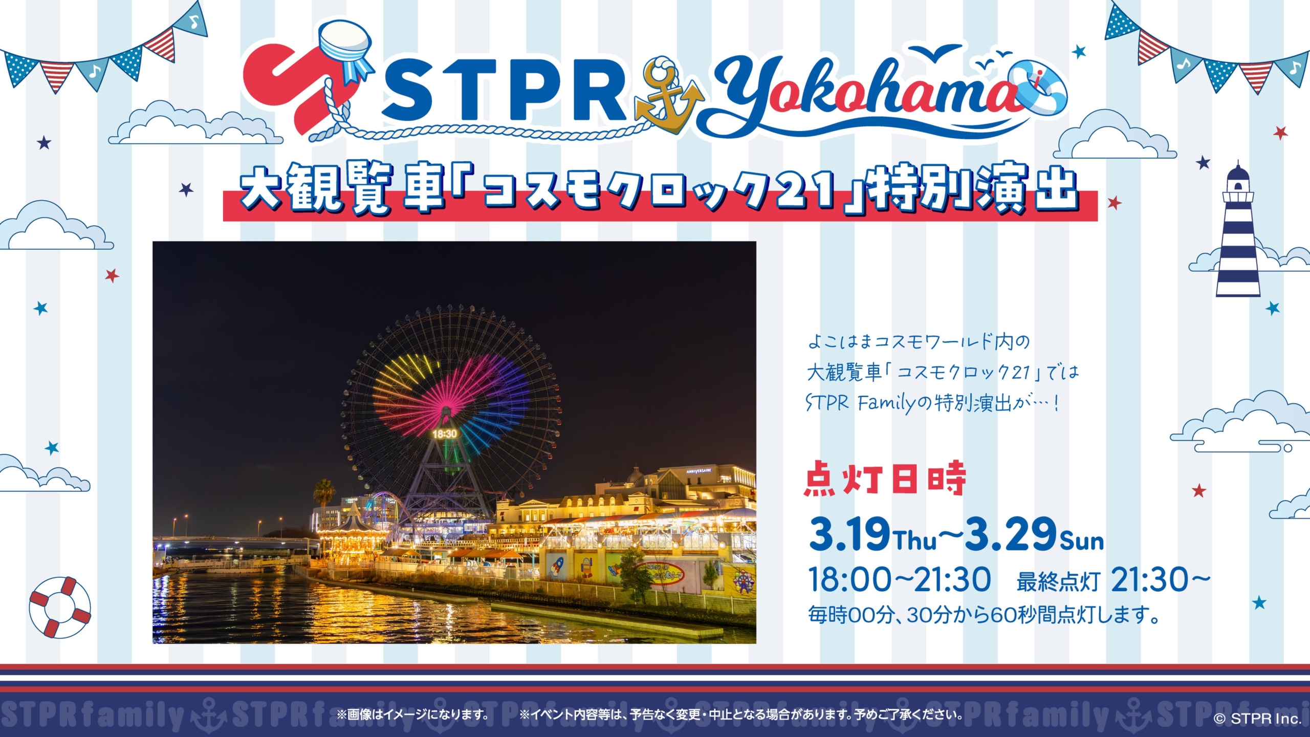 株式会社STPR(本社:東京都渋谷区、代表:柏原真人、以下「STPR」)は、横浜市と連携して開催中のコラボイベント「STPR Family×Yokohama」(2026年3月13日(金)~3月29日(日))の一環として、横浜・みなとみらいのランドマークである大観覧車「コスモクロック21」にて、STPR Family※の特別演出を実施します。