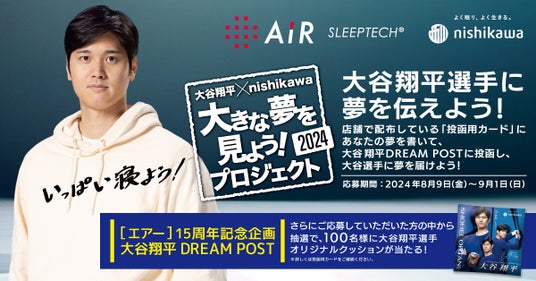 西川株式会社(以下nishikawa)は、 SLEEP TECH(R)ブランド[エアー]のブランド誕生15周年に際し、メジャーリーガーの大谷翔平選手と共に行う『大きな夢を見よう!プロジェクト』の一環として、「大谷翔平 DREAM POST」を2024年8月9日(金)~9月1日(日)の期間、全国の[エアー]販売店(※)に設置します。 専用カードに叶えたい夢を記入し「大谷翔平 DREAM POST」に投函し、応募いただいた方の中から抽選で100名様に大谷翔平選手のオリジナルデザインクッションをプレゼントします。