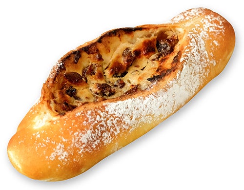 フランスパンにラム酒漬けレーズンとクリームチーズをのせ焼き上げました。 噛むほどに小麦が香ばしく、香り豊かなラムレーズンの甘みをクリームチーズが引き立てます。