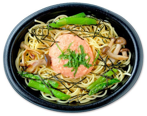 ピリ辛が美味しい明太子クリームパスタに、アスパラ・ぶなしめじ・大葉・刻み海苔をトッピング。クリーミーな味わいの中のピリ辛さが食欲をそそります。