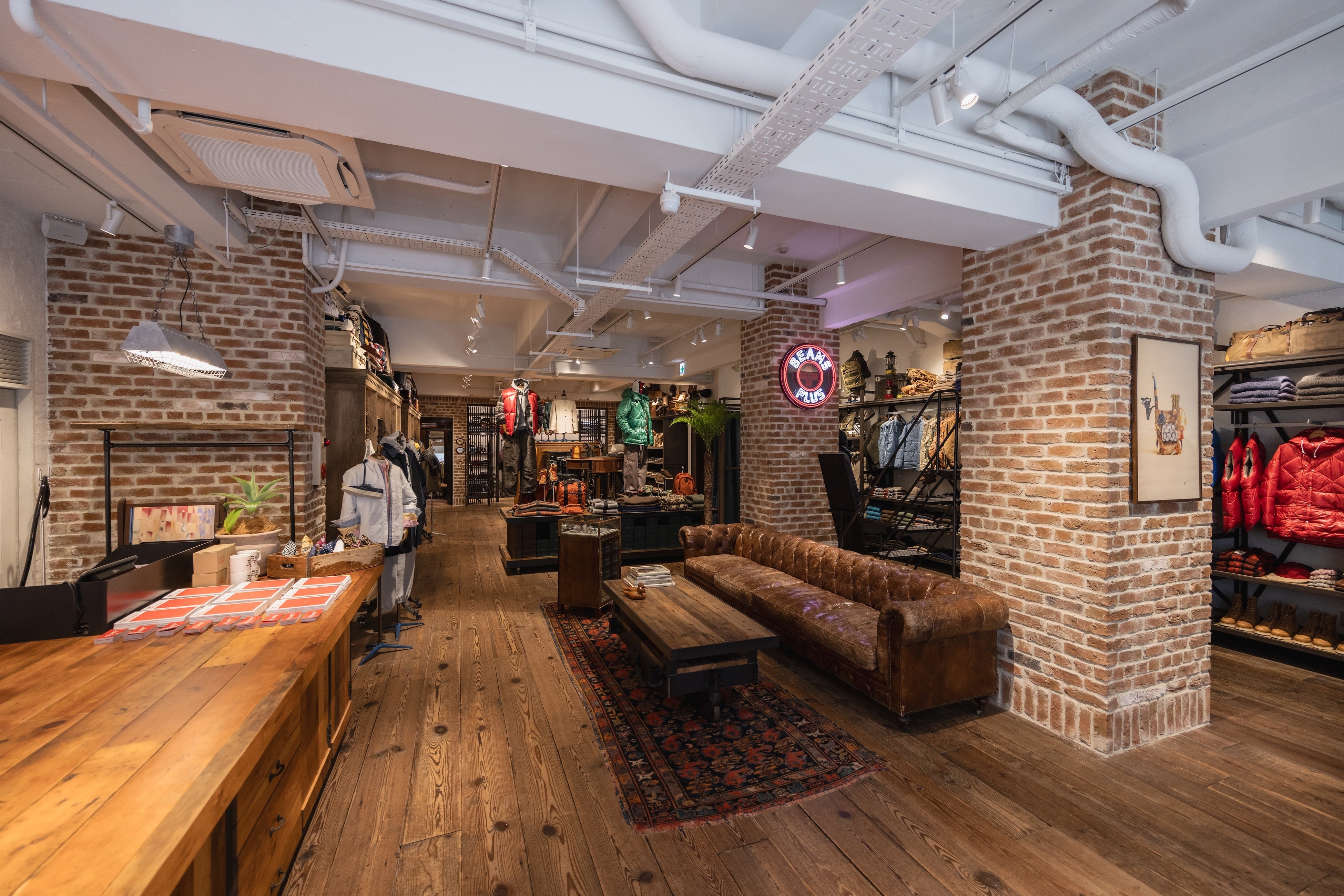 店舗の内装は、〈BEAMS PLUS〉のルーツでもあるアメリカの世界観をベースに、東海岸・ニューヨークのロウアー・イースト・サイドにあるブリックウォールの建造物をイメージしています。ウィンドウには過去に使用された〈BEAMS PLUS〉の洋服タグをモチーフにしたサインが設置され、店内に入ってすぐに設けられたソファーや大型レジカウンターでは、スタッフと会話を楽しみながらゆっくりとお買い物いただけます。