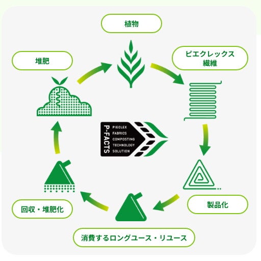 「P-FACTS」(ピーファクツ:PIECLEX FAbrics Composting Technology Solution)は、ピエクレックス社が植物由来のポリ乳酸素材「電気の繊維」ピエクレックスを使用したアパレル製品や繊維製品を回収し、堆肥化までを一貫して行う循環インフラです。多くのパートナー企業、自治体、福祉施設、学校法人などのステークホルダーと連携し、既に運用が始まっています。