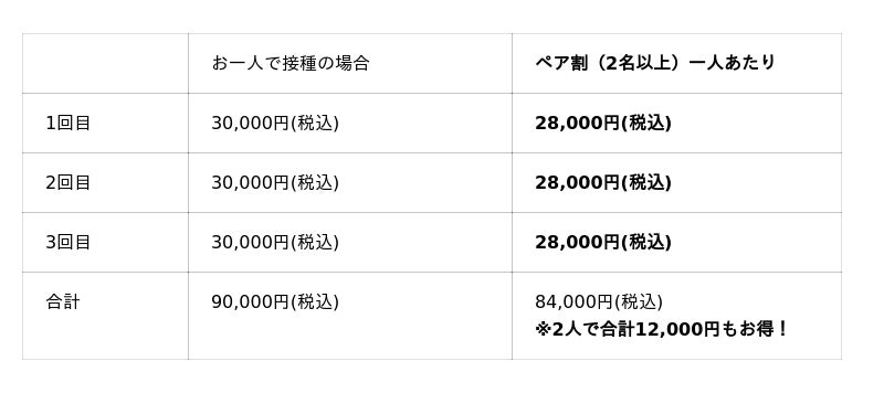 はい、可能でございます!もちろんペア割価格<お一人様あたり84,000円(税込み)>で施術いたします。例えば奥様が既に公費でワクチン接種済みの場合については男性1名のみワクチン接種も可能です。その場合は90,000円(税込)でございます。