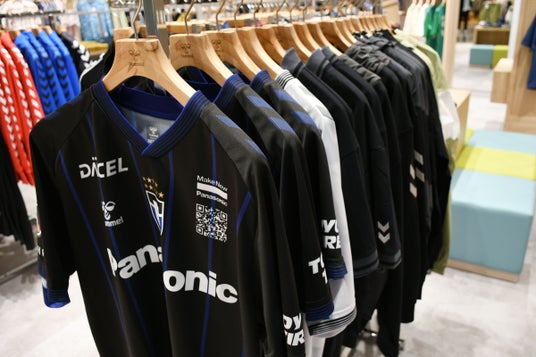 ガンバ大阪の関連アイテムも年間を通して取り扱い、ユニフォームの他、ガンバ大阪エンブレム付きのコラボアパレルも展開します。