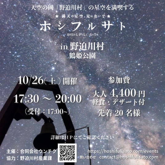 アストロツーリズムのイベント企画・運営を手掛けている合同会社ウンチク(本社:奈良県奈良市。代表社員:太田原 章巨)は、2024年10月26日(土)に、奈良県野迫川村の鶴姫公園にて、星空イベント「ホシフルサト」を開催いたします。