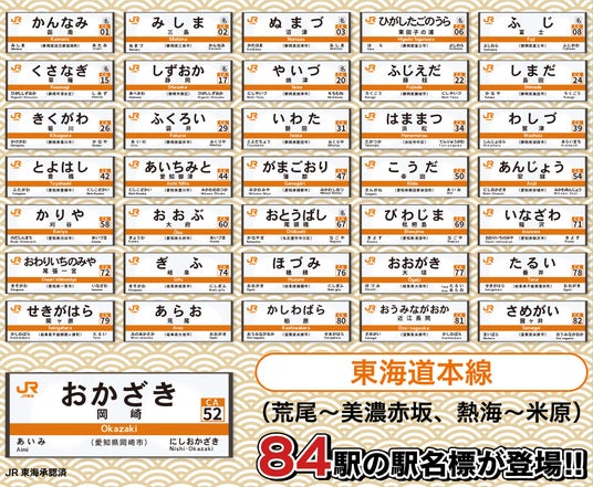 本サービスでは、JR東海承認済の東海道本線(荒尾~美濃赤坂、熱海~米原)の84駅の駅名標 をラインナップ。今後の拡充も予定しています。