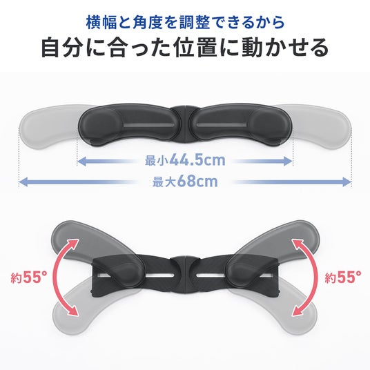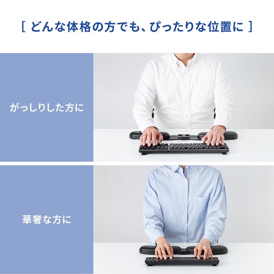 44.5cmから68cmまで幅を調整できる可変式のリストレストで、テンキーレスキーボードやフルサイズキーボード、大型ノートPCにもぴったりフィットします。また、角度の調整も可能なので、どんな作業環境でも使用可能です。