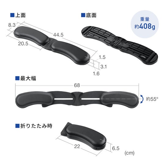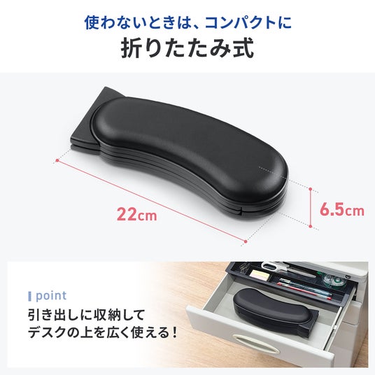 このリストレストは折りたたみ式で、収納や持ち運びも簡単です。折りたたむと幅約22cm、高さ約6.5cmとコンパクトになり、デスクの引き出しやバッグにもすっきり収まります。使いたいときにさっと広げられる便利なアイテムです。