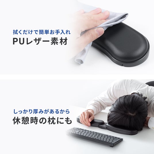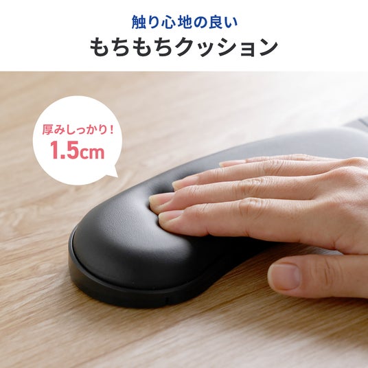 厚みのあるPUクッションを採用し、長時間の作業でも手首にかかる負担を軽減します。弾力がありながらも優しくフィットし、快適なタイピングをサポートします。しっかり厚みがあるため、デスクワークだけでなく、読書やタブレット操作時の肘置き、休憩時の枕としても活用でできます。