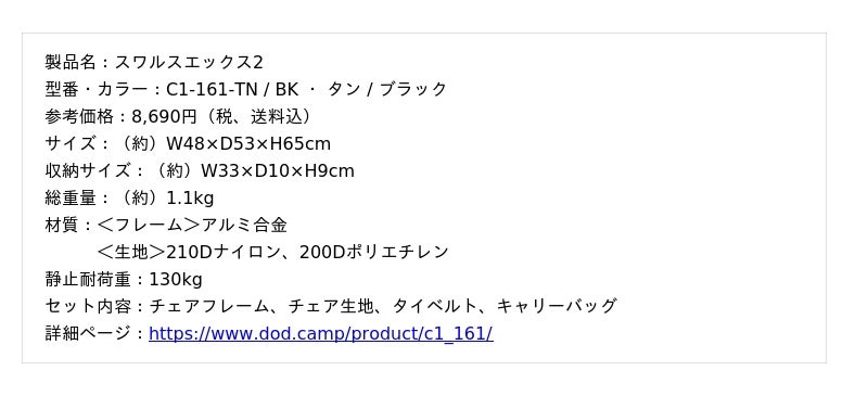 ビーズ株式会社(本社:大阪府東大阪市、代表取締役社長:大上響)が展開するアウトドアブランドの「DOD」は、携行性と快適性を両立させたコンパクトチェア「スワルスエックス2」を2025年6月27日より発売しました。 「スワルスエックス2」は、2018年より販売しているロングセラー「スワルスエックス」のリニューアルモデル。特徴的なX(エックス)型のフレーム構造による安定性とコンパクト収納による携行性の高さは前モデルでもご好評いただいております。 今回、生地やフレーム構造、キャリーバッグの仕様をゼロから見直すことで、より高い携行性とアウトドアに適した耐久性とデザイン性を実現しました。 徒歩キャンプ、ソロキャンプ、ファミリーキャンプ、フェス、ツーリング、運動会など、 “荷物は最小限に、でも座り心地には妥協したくない”すべての外遊び好きに贈る、汎用的に使えるチェアです。 製品詳細ページ:https://www.dod.camp/product/c1_161/