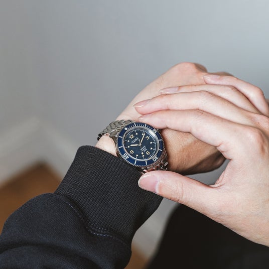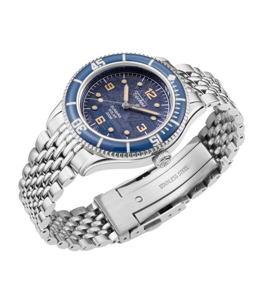 ネイビーモデルは、深海を思わせる落ち着いた色調の中に、メテオライト特有の結晶模様が静かに浮かび上がる仕上がり。ヴィンテージダイバーズの重厚感と、宇宙素材ならではのロマンが融合した、知的で洗練された一本です。