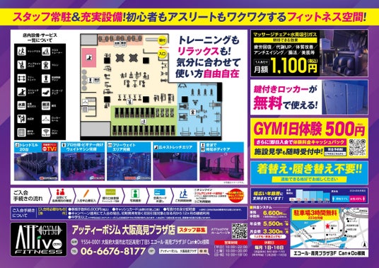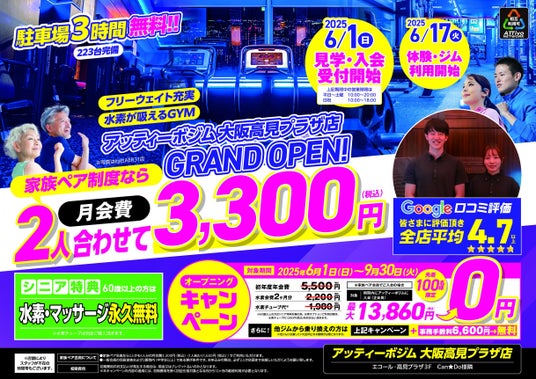 全国27店舗目となるアッティーボジムが2025年6月1日(土)、大阪市此花区「エコール・高見プラザ」にオープンします。 大阪1号店(大阪りんくう泉南)はYahoo!ニュースはじめ各種メディアでも話題となり想定を大幅に上回る会員様に利用を頂いています。〔ハイパーリンク〕今回の高見プラザ店も、そんなアッティーボジムならではの“心まで動くオンリーワンの進化系カントリー派ジムです。 スタッフがお出迎えいたします 「半数がジム未経験者」だからこそ、“心地よさ”を重視した空間へ。 アッティーボジムの利用者の多くは、これまでジムに通ったことのない方々。だからこそ、スタッフが常駐し、会話とサポートを重視しています。照明やアート、空間デザインにこだわり、「気まずさ」や「緊張感」を払拭することで、誰もが続けやすいジムを目指しています。 マシンの使い方等はお気軽にスタッフまで! 今度は“宇宙とサファリ”!? 心まで上がる空間演出。今回の高見プラザ店は、ジム内随所に動物のモチーフを配した遊び心ある空間に仕上げました。 家族で通えるジムへ。月額3,300円で2人まで通えるペア制度。 お得なオープニングキャンペーン実施! YouTube:家族ペアでも!月会費3300円で本格マシンを体験できる!ーATTivoGYMー 「ジム=一人で黙々と鍛える」というイメージを覆し、夫婦や親子で通える“家族ペア制度”を展開。60歳以上の方は水素吸引とマッサージチェアが永久無料と、健康づくりを応援するシニア向け特典も充実しています。 【施設概要】 店舗名:アッティーボジム 大阪高見プラザ店 所在地:大阪市此花区高見1丁目5番51号 エコール高見プラザ3F TEL:06-6676-8177 見学・入会受付開始日:2025年6月1日(土) 体験・利用開始日:2025年6月17日(火) 営業時間:平日 10:00~22:00 / 土曜 10:00~20:00 / 日祝 10:00~18:00 URL:https://attivo.jp/takamiplaza.html 店舗入口 圧巻の有酸素エリア 大人気「音波振動マシン」を導入! 充実のマシンエリア 集中して自分と向き合えるフリーウェイトエリアも 【メディア掲載実績】 (Yahoo!ニュース エキスパート) アッティーボジムの取り組みは、Yahoo!ニュースにも多数掲載されています。 ・【泉南市】大阪初!月会費「家族2人で3300円」の夢のスポーツジム “退会率わずか2%”の実力とは(旅する日々の記憶と記録。matka08) - エキスパート - Yahoo!ニュース 【名古屋市千種区】愛知初上陸、老若男女が集う月3,300円の「普通じゃない宇宙ジム」今池にオープン!月額3,300円で通えるスポーツジムがイオン石巻東店内にオープン!安さの理由を訊ねてきた【石巻市】 【すべての方にワクワクするフィットネスライフを送っていただくために】 アッティーボジムはあえてやること・やらないことを決めています。 ・24時間営業はしません ・プールやシャワーは設置しません ・ジム初心者が足を踏み入れにくい雰囲気をつくりません ・スタッフがジムデビューをサポートします ・マシンや設備に妥協しません ・なにより「楽しさ」を追求し進化し続けます 「地域密着の進化系カントリー派ジム」で、フィットネスの新時代をつくる! アッティーボジムは 都市型ジムの常識を覆し、地方のライフスタイルに寄り添う新たなジムの形を目指します。