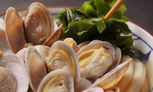 【あふれんばかりの山盛りあさりに、磯の香りを引き立てるわかめ】