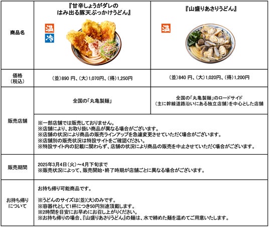 株式会社丸亀製麺(本社:東京都渋谷区、代表取締役社長:山口 寛)が展開する、食の感動体験を追求し、手づくり・できたてにこだわる讃岐うどん専門店「丸亀製麺」は、全国の丸亀製麺にて『甘辛しょうがダレのはみ出る豚天ぶっかけうどん』、全国のロードサイド店を中心とした店舗にて『山盛りあさりうどん』を2025年3月4日(火)から期間限定で販売します。