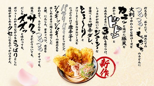 完全新作!大きな豚天3枚とできたてうどんで、おいしさあふれる『甘辛しょうがダレのはみ出る豚天ぶっかけうどん』今年も帰ってきた春の定番!旨みあふれる『山盛りあさりうどん』