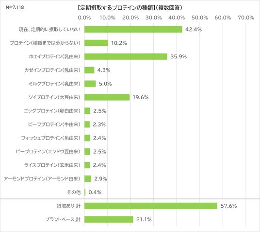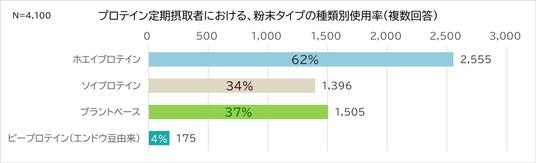 「プロテイン粉末タイプ」「プロテイン顆粒タイプ」を買った経験者に、現在定期的に摂取しているプロテインの種類についてきいたところ、粉末プロテイン摂取者の約37%がプラントベースを使用。プロテイン定期摂取者全体において、粉末プロテインの使用率を種類別にみると、ホエイプロテインが約62%、ソイプロテインが約34%、ピープロテインも約4%が摂取していた。