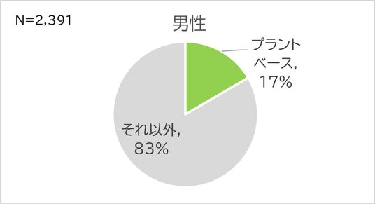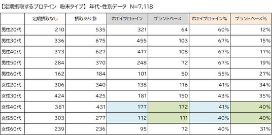 粉末タイプのプロテイン経験者の中で、現在も定期的に粉末プロテインを摂取している人は57.6%、そのうちの約25%がプラントベースのプロテインを飲んでいた。粉末プロテインを定期的に飲んでいる経験者のうち、男性は17%、女性は36%がプラントベースプロテインをメインで飲んでいた。女性の中でも40、50代で、ホエイプロテインとプラントベースがほぼ同率で購入される傾向が見られた。