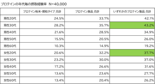 「自身で買って、食べたり飲んだりしたことがあるもの」を、複数回答で聞いたところ、プロテイン製品を購入したことがあると回答したプロテイン経験者は、3割強。粉末・顆粒タイプの購入経験者は回答者全体で2割弱だった。「粉末タイプ」(18%) と「焼き菓子タイプのプロテインバー」(17%) が特に人気を集めた。次いで「プロテインヨーグルト」(10%)、 「プロテインドリンク・スムージー」(10%) も一定の需要があることが確認された。男女の年齢別にみると、男性は、30代の43.2%が、女性は20代の37.7%がプロテイン製品の喫食・摂取経験があり、女性年齢別でみると、比較的若い年代の摂取経験率が高い傾向が見られた。