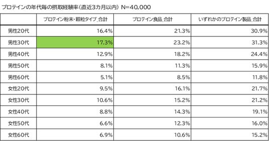 「直近3か月以内に、自身で買って、食べたり飲んだりしたことがある」プロテイン製品の購入経験を聞くと、いずれかのプロテイン製品を購入したことがあると回答したプロテイン経験者は約2割強。粉末・顆粒タイプの購入経験者は、回答者全体の約1割だった。粉末・顆粒タイプの喫食・摂取経験がもっとも高かったのは、30代男性だった。