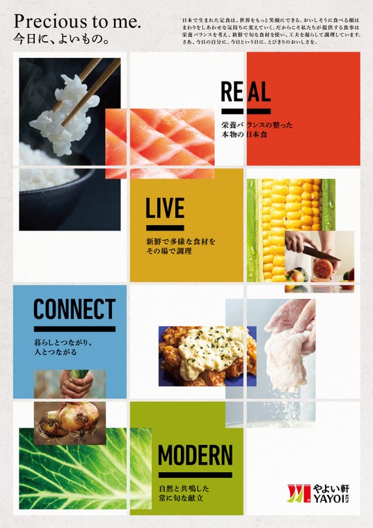 日本で生まれた定食は、世界をもっと笑顔にできる。美味しそうに食べる顔はまわりをしあわせな気持ちに変えていく。だからこそ私たちが提供する食事は栄養バランスを考え、新鮮で旬な食材を使い、工夫を凝らして調理しています。さあ、今日の自分に。今日という日に。とびきりのおいしさを。