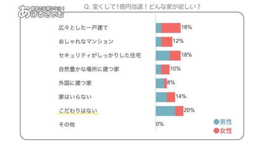 また、男女の回答を分けると面白い差が出ていました。女性回答で最も多かったのが「広々とした一戸建て」で28%、男性回答では「こだわりはない」が28%と最多となったのです。