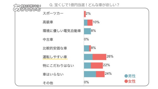 最も多い回答となったのは「運転しやすい車」26%で、車の見栄えやブランド的な面よりも、運転のしやすさといった機能面で優れた車を重視する人が多いことがわかります。
